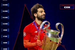 萨拉赫在2017年加盟利物浦时身价4000万欧,之后凭借出色发挥身价一路上涨,在2019年达到巅峰的1.5亿欧,之后随着年龄增大身价开始走下坡路,本赛季发挥大幅下滑的情况下身价目前已经跌至3000万欧。